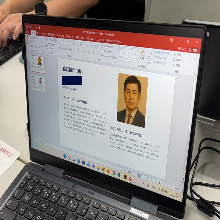 最初のプログラムは「自己紹介スライド作成」。各自がChatGPTに自分の経歴や業務内容を入力し、自己紹介文を生成。そのまま使うのではなく、表現を調整したり、絵や写真を添えて「人となりが伝わる」スライドに仕上げました。