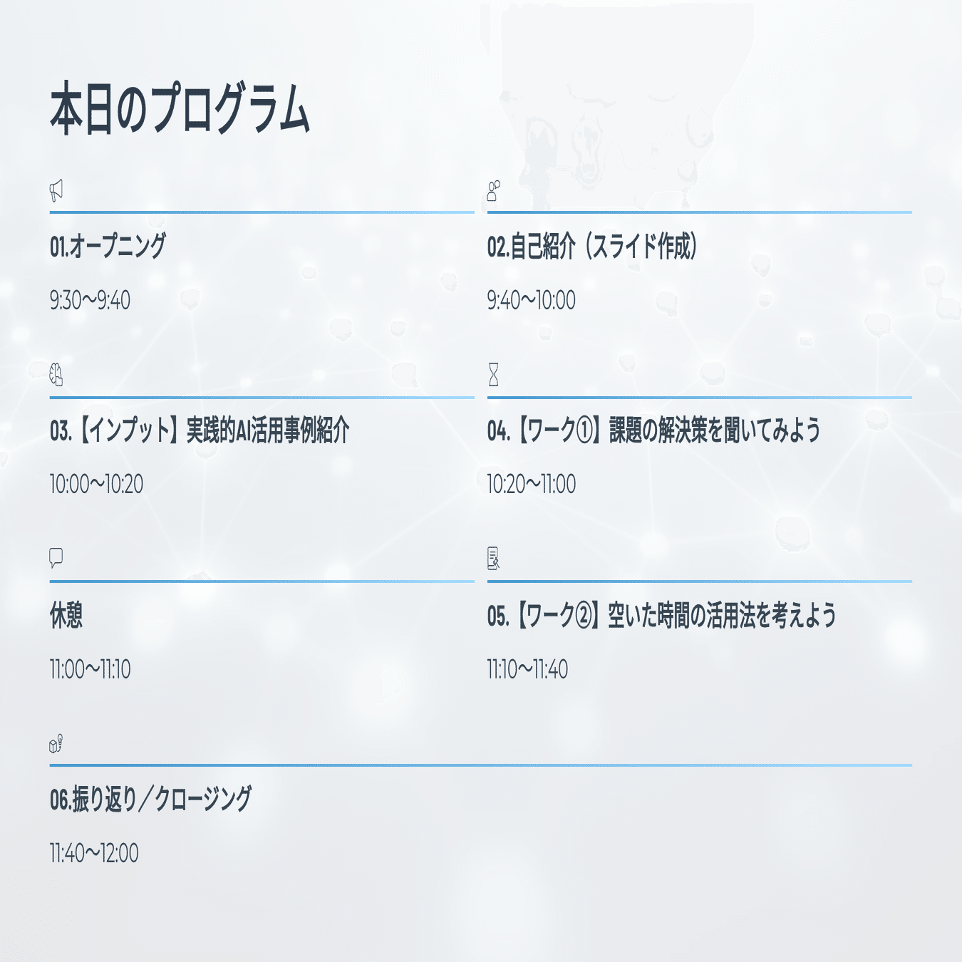 STEP1では「生成AIを知る」ことを目的に基礎的な操作を体験しましたが、STEP2となる今回は、実務に直結する活用アイデアを整理し、さらに「空いた時間をどう使うか」を考える実践的な内容に取り組みました。この記事では、自己紹介スライド作成から業務課題ワーク、空いた時間の活用法まで、当日の様子を詳しくレポートします。