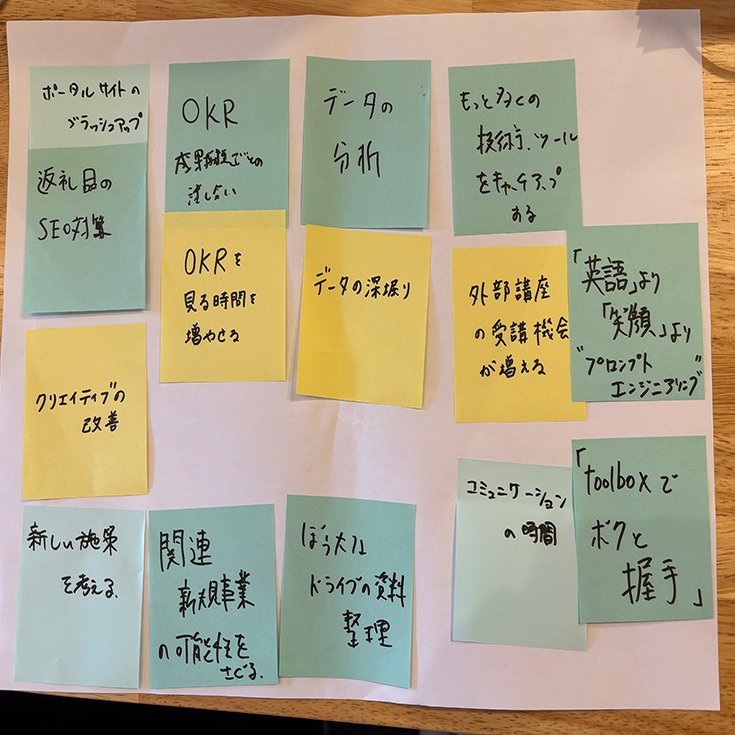 投票の結果、OKRの可視化とふるさと納税の事務処理関連に多くのシールが集まり、組織として優先的に解決すべき課題が可視化されました。