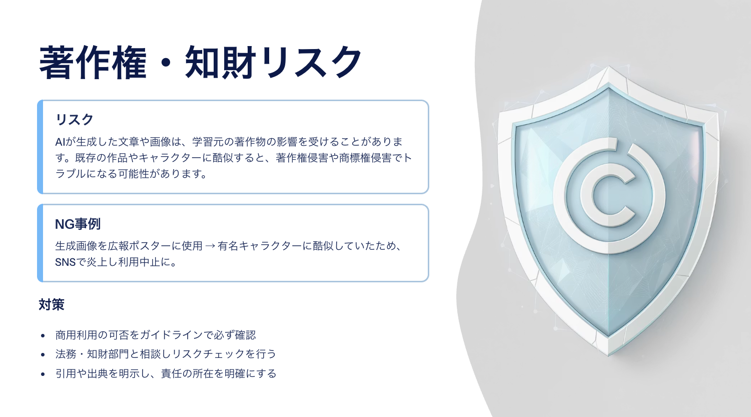 2. 著作権・知財リスク: AIが生成した文章や画像は、学習元の著作物の影響を受けることがあり、既存の作品やキャラクターに酷似すると著作権侵害や商標権侵害でトラブルになる可能性があること。