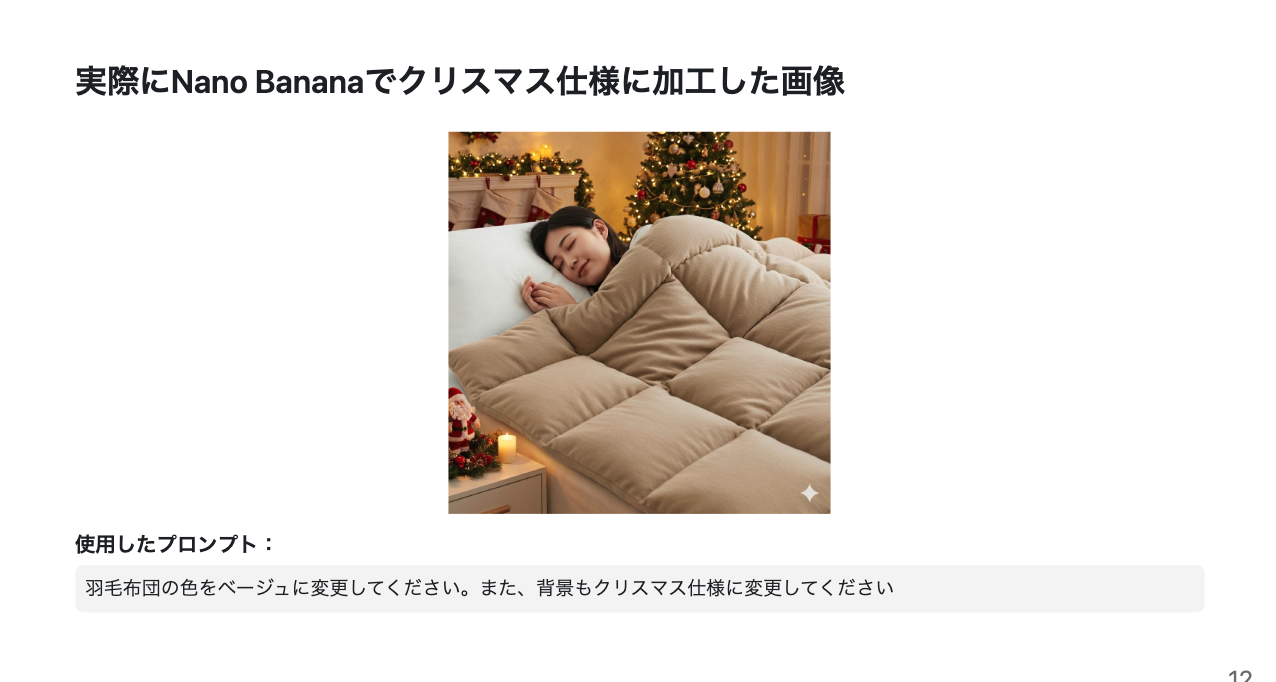 事例2:既存画像の編集・加工 — 布団の画像をクリスマス仕様に変更(布団の色変更、背景にクリスマスツリーやプレゼントを追加。指示していないサンタの置物まで配置する「遊び心」も見られた)