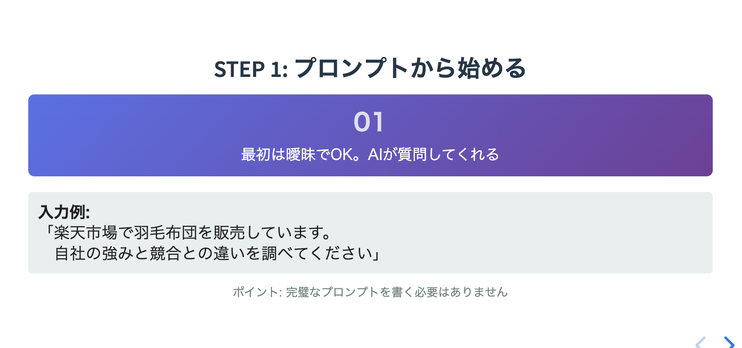 ディープリサーチの使い方として、「プロンプトを全部自分で考えることをまずやめる」ことが第一歩であると紹介しました。実際の手順として、最初に投げたプロンプトは非常にシンプルで「ECサイトで羽毛布団を販売しています。自社の強みと競合の違いを調べてください。プロンプトを書いておいてあげて」という程度のもの。これに対してAIが「対象業界は?」「会社はどこにありますか?」「主な競合は?」「知りたいことは?」と質問してくるので、それに答えていくことでプロンプトが精緻化されていく手法を実演しました。
