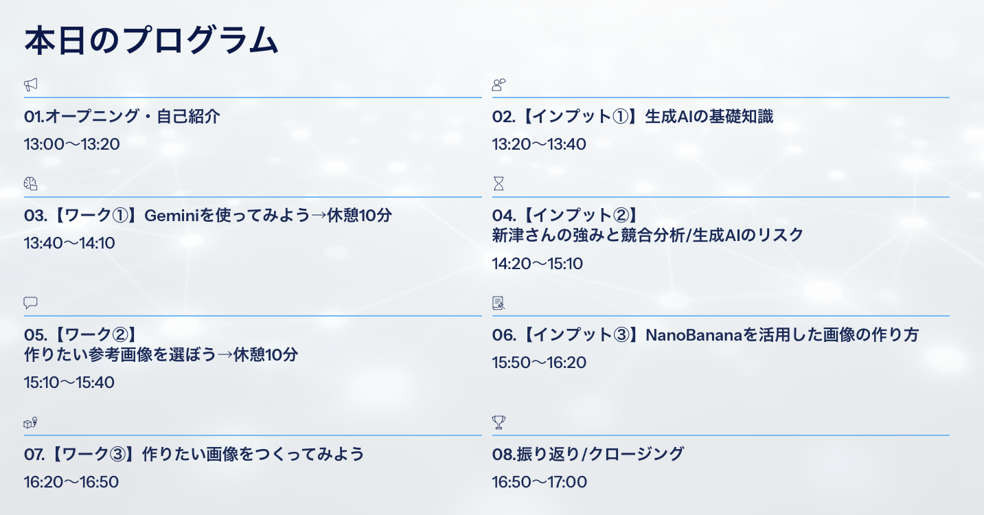 本ワークショップは、約4時間のプログラムで実施しました。インプット講義とワークを交互に配置し、学びと実践を往復する設計としています。
